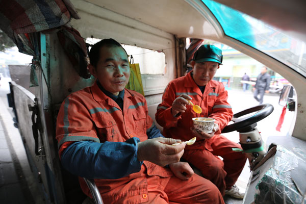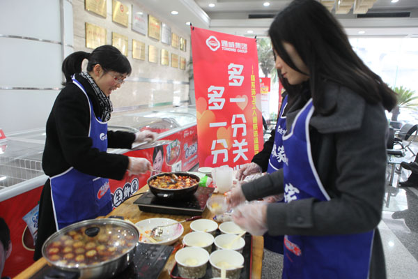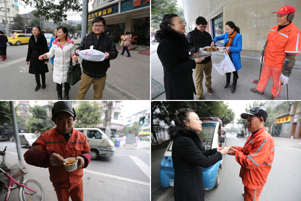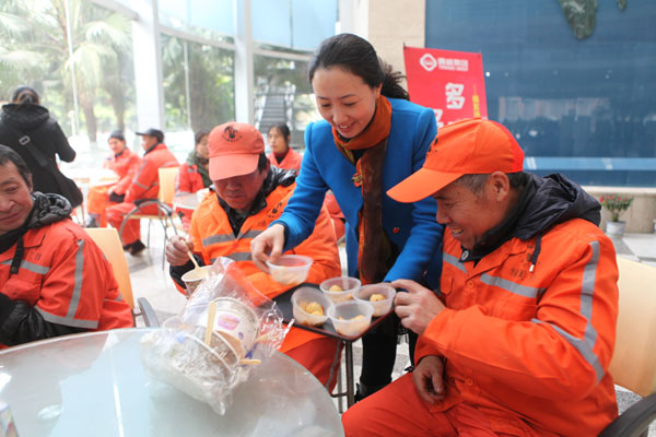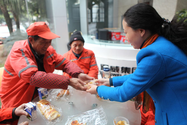 1月13日總部組織員工對環(huán)衛(wèi)工人捐贈棉衣、棉被。1月15日,高新區(qū)工會何處長帶領(lǐng)肖家河街道40多位環(huán)衛(wèi)工人到總部,下午2點(diǎn)剛剛從工作崗位上下班還沒有用午餐的環(huán)衛(wèi)工人一坐下,集團(tuán)工會李主席和工會其他成員為環(huán)衛(wèi)工人送上了面包和溫?zé)岬呐D蹋ㄍ称返耐聜兠χ鵀樗麄冎笾~丸和魚餃,同事們把一碗碗熱氣騰騰魚丸送到每個環(huán)衛(wèi)工人的手上,環(huán)衛(wèi)工人們接過香噴噴的魚丸連聲道謝。第一次享受到別人為他們送上的美食,從他們臉上我們看到了幸福和喜悅。送走40多位環(huán)衛(wèi)工人,集團(tuán)工會李主席在環(huán)衛(wèi)公司工會曾主席的帶領(lǐng)下將煮熟的魚丸送到了他們正在勞動的崗位上,一位環(huán)衛(wèi)工人端著這熱氣騰騰的魚丸,激動的說“通威真是個不錯的公司,我們吃著這碗魚丸心理真的很溫暖”。同時,通威集團(tuán)工會和高新區(qū)工會共同為肖家河街道200多名環(huán)衛(wèi)工人每人贈送兩袋通威海南純生魚丸作為對環(huán)衛(wèi)工人新春的慰問,希望他們能在社會各界的關(guān)懷下度過一個溫暖、祥和的春節(jié)。