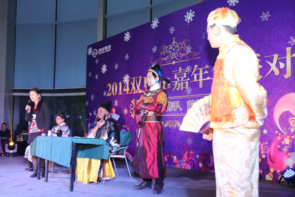 在幸福的回答過后,集團(tuán)2014慶圣誕迎元旦嘉年華派對(duì)又給現(xiàn)場觀眾安排了近距離參與《非誠勿擾》的機(jī)會(huì)。忸怩著婀娜多姿的身軀,邁著小碎步,五位國色天香的佳麗,手拿心形燈,擺著各種poss隆重登場。“今天這個(gè)征婚啊!一定要高帥富,什么屌絲啊!什么……”在佳麗自爆招婿標(biāo)準(zhǔn)之后,上臺(tái)來征婚的“官人們”著急了。其中,一位“大人”更是直言,“傷不起”。在一番深情的表白之后,佳麗們都“不屑”。此時(shí),臺(tái)下的觀眾著急了,紛紛喊出:嫁了吧!嫁了吧……