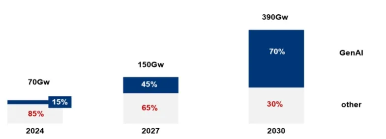 根據(jù)咨詢機構(gòu)麥肯錫2024年的最新研究,AI對算力需求的拉動將直接帶動數(shù)據(jù)中心建設(shè)規(guī)模提速,同時帶來對電力需求的爆發(fā)式增長。保守估算,到2030年,全球數(shù)據(jù)中心服務(wù)器的能耗將高達390GW,而其中70%是被AI算力所消耗。