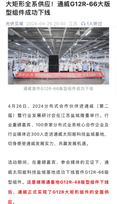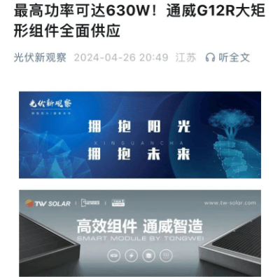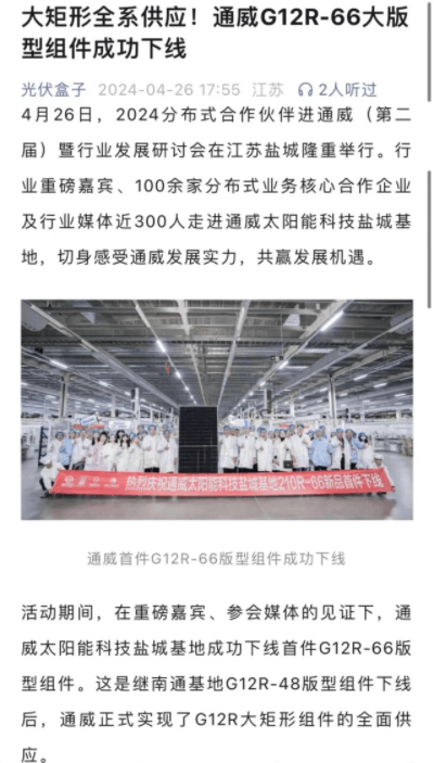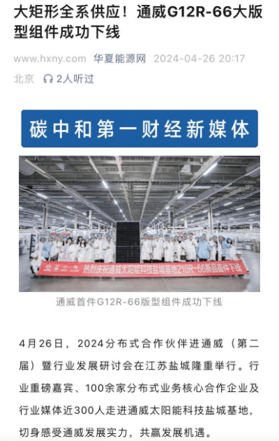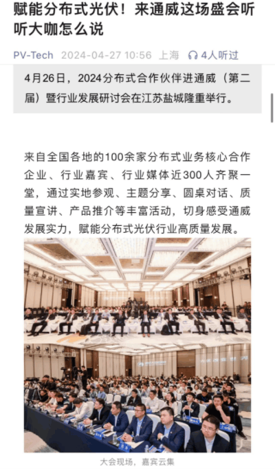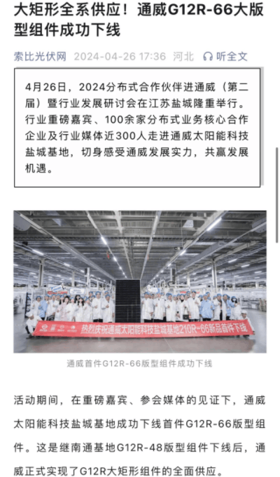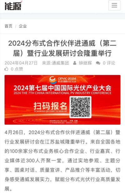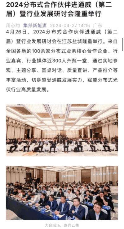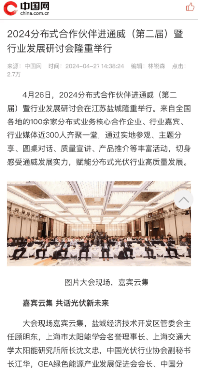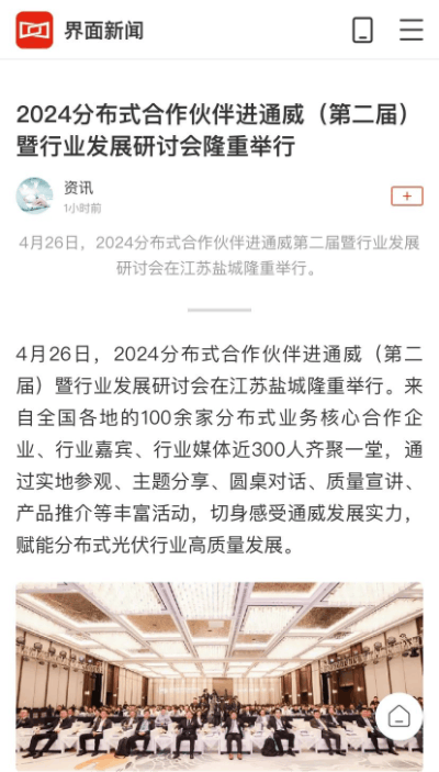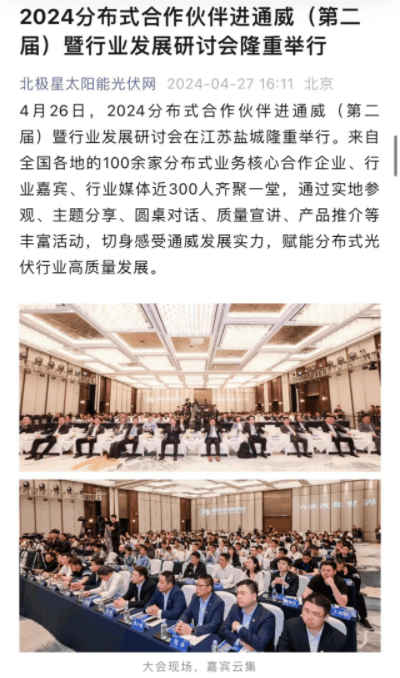 2024分布式合作伙伴進(jìn)通威(第二屆)暨行業(yè)發(fā)展研討會、通威G12R-66大版型組件成功下線,受到中國能源報、中國電力報、《能源》雜志、能源一號、黑鷹光伏、國際能源網(wǎng)、索比光伏網(wǎng)、華夏能源網(wǎng)、PV-tech、集邦咨詢、北極星太陽能光伏網(wǎng)、世紀(jì)新能源網(wǎng)、ofweek太陽能光伏網(wǎng)、SOLARZOOM、光伏們、光伏盒子、能源嚴(yán)究院、光伏資訊、趕碳號科技、光伏見聞、全球光伏、分布式能源網(wǎng)、光伏薈、能源圈、能見、光伏新觀察、綠能新媒、草根光伏、江蘇經(jīng)濟(jì)報、鹽阜大眾報、鹽城電視臺等權(quán)威主流媒體、行業(yè)媒體的關(guān)注報道,賦能分布式光伏高質(zhì)量發(fā)展。
