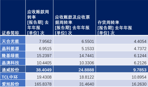 硅料、電池片雙龍頭通威股份,在去年的應(yīng)收賬款周轉(zhuǎn)率高達38.40次。