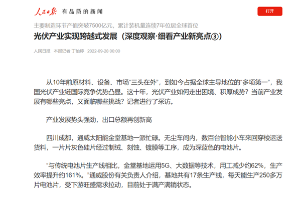 9月28日,《人民日?qǐng)?bào)》發(fā)表題為“光伏產(chǎn)業(yè)實(shí)現(xiàn)跨越式發(fā)展”的文章,在報(bào)道中聚焦及點(diǎn)贊通威太陽能金堂基地智能制造水平及5G技術(shù)的創(chuàng)新應(yīng)用。