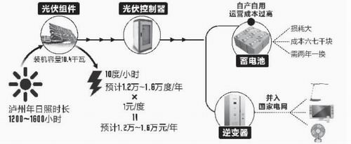 王坤介紹,氣象部門披露的數(shù)據(jù)顯示,多年以來,瀘州的年日照時長可達1200至1600小時。“根據(jù)我目前的裝機容量。太陽每照耀一小時,即可發(fā)電10度。一年下來,可發(fā)電1.2萬度至1.6萬度。國家電網(wǎng)目前收購價為1元/度,這也意味著,單靠樓頂這個發(fā)電站,保守估計,每年可實現(xiàn)收入1.2萬元。建設(shè)這個小型發(fā)電項目,投入為7萬余元。7年即可收回成本。由于使用年限可達20至25年,剩下的時間,則為純利潤。”