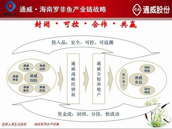 同時,通威將聯(lián)合一部分在某方面有特長(比如,在苗種選育上有基礎(chǔ),有的能夠把苗種選育或者幾個家系做好,有的能夠把中間的細分產(chǎn)品做好)的機構(gòu)、人員、企業(yè),形成這種戰(zhàn)略聯(lián)盟。在這個行業(yè)里面,再大的企業(yè)都很難自己解決一籃子的問題,而且也不是最優(yōu)和最低成本的方式。大企業(yè)有所為有所不為,小企業(yè)專精而為,協(xié)同做好,我想這就是大小企業(yè)聯(lián)手的生存方式。