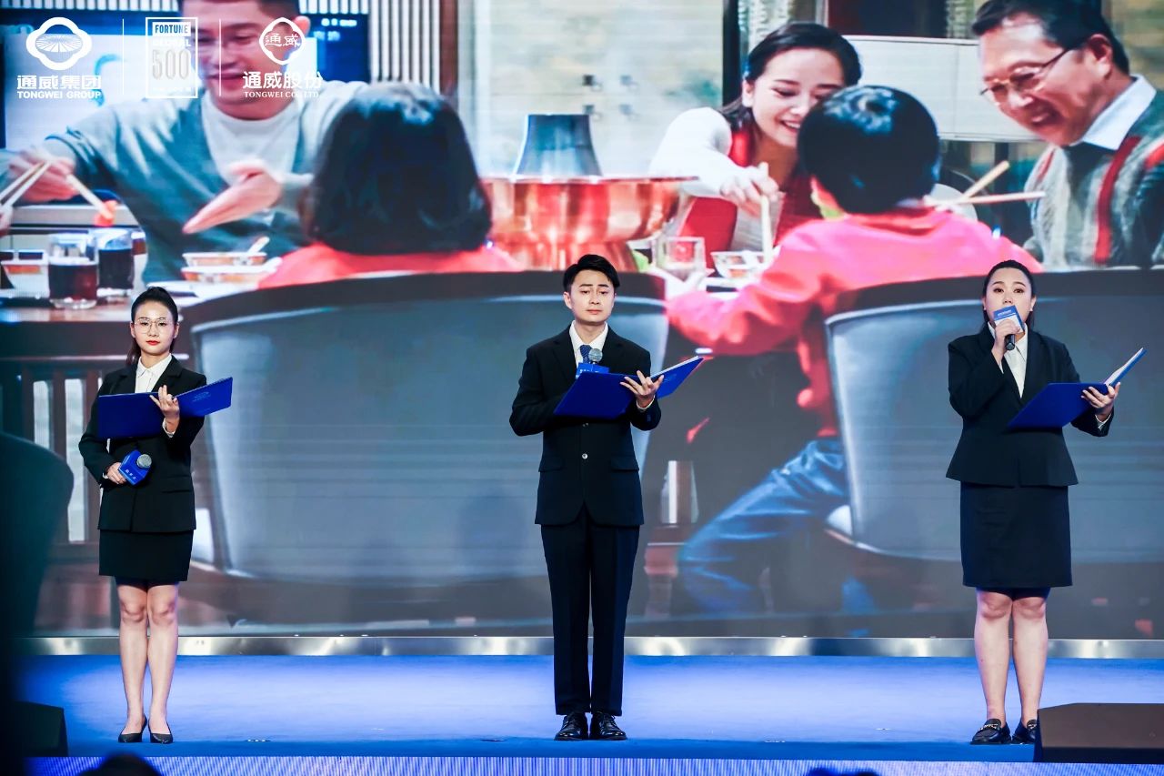 通威新能源帶來《迎著光 我們一步一毫厘》、通威太陽能科技帶來《行而不輟 穿越寒冬》、通威農發帶來《更好的未來》、通威微電子帶來《“晶”于探索 “芯”向未來》、通威集團管理總部帶來《如果你要寫通威》、通威食品帶來《堅守的力量》、通威太陽能帶來《未來之光 通威力量》、永祥股份帶來《信念:燃燒的力量》、好主人寵物食品帶來《英雄》、通威股份管理總部帶來《但趁年華 且爭朝夕》精彩朗誦。