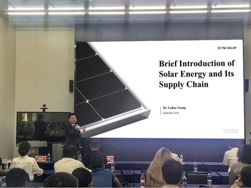 同時(shí),通威股份光伏商務(wù)部組件營(yíng)銷(xiāo)市場(chǎng)分析負(fù)責(zé)人楊鷺豪向研討班學(xué)員介紹了太陽(yáng)能的重要性與優(yōu)勢(shì),以及其在全球能源消費(fèi)結(jié)構(gòu)中的地位和增長(zhǎng)趨勢(shì),并深入分析了光伏組件供應(yīng)鏈、技術(shù)進(jìn)步以及市場(chǎng)動(dòng)態(tài),為學(xué)員提供了一個(gè)全面的太陽(yáng)能行業(yè)概覽。
